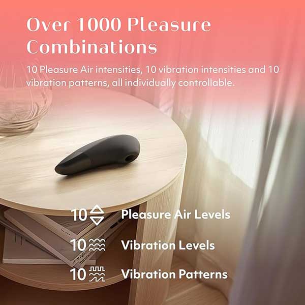 - Công nghệ Pleasure Air kết hợp rung động: 10 mức sóng áp lực không chạm + 10 mức rung + 10 mẫu rung, điều khiển độc lập, tạo hơn 1000 kết hợp khác nhau.